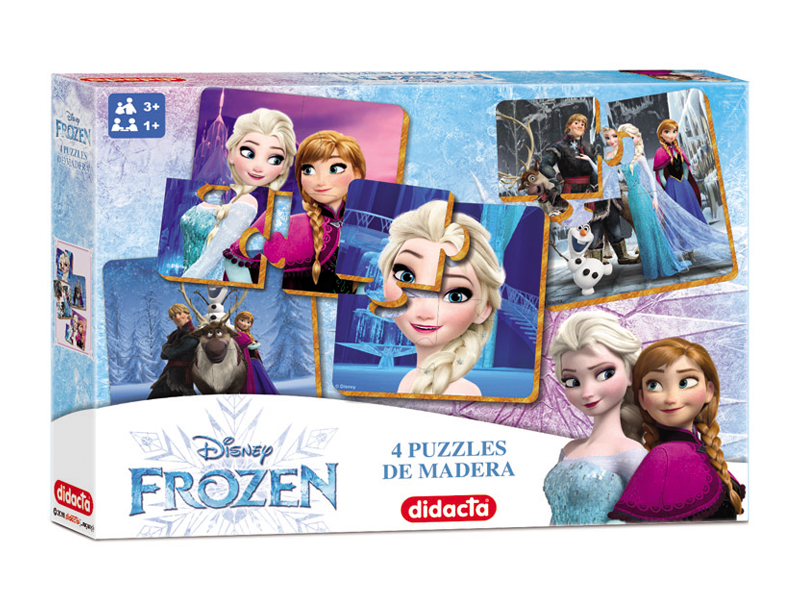 4 puzzles de madera, de 4 piezas cada uno, con diferentes imágenes de los personajes de Frozen. Muy resistentes