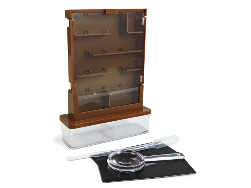 Contenido: 1 cubierta superior, 1 tapa frontal, 1 pared de cámara, particiones para el laberinto, 1 cabina de plástico, 1 tapa frontal transparente para el contenedor de suelo, 1 contenedor de suelo, 1 maceta de agua, 8 soportes de plantas, 1 cuentagotas, 1 lupa y 2 tarjetas cobertoras.