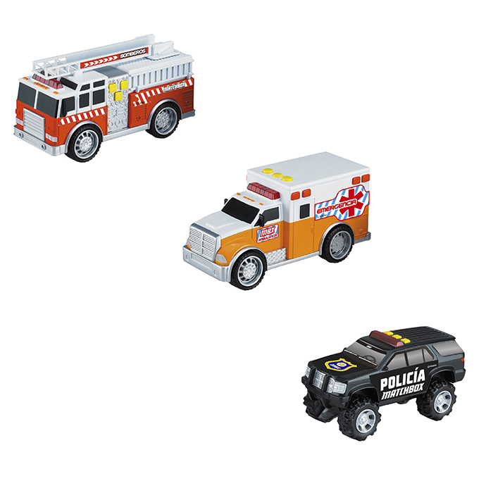 Camión de emergencia Matchbox, bombero, policía y ambulancia con luz y sonido.