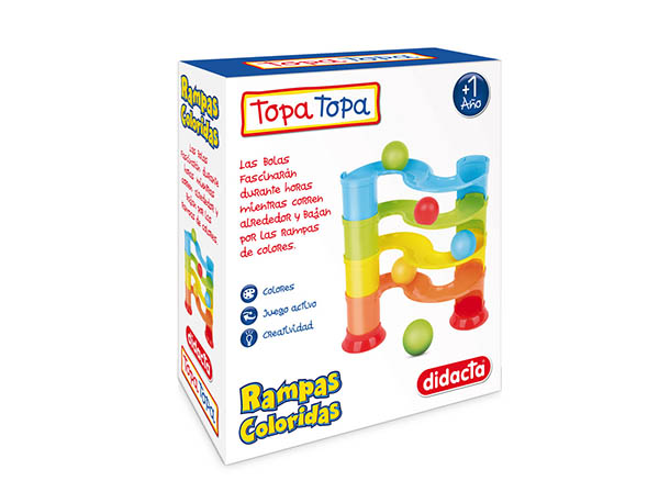 TOPA TOPA, los juguetes que introducen al niño en el mundo de las formas, los colores y el juego, estimulando su creatividad, habilidad manual y sus sentidos. Han sido diseñados con formas redondeadas y materiales de calidad y resistencia, estudiados para garantizar la seguridad del niño. Contiene 4 bolas de coloras y 4 rampas para que bajen las bolas alrededor de ellas.